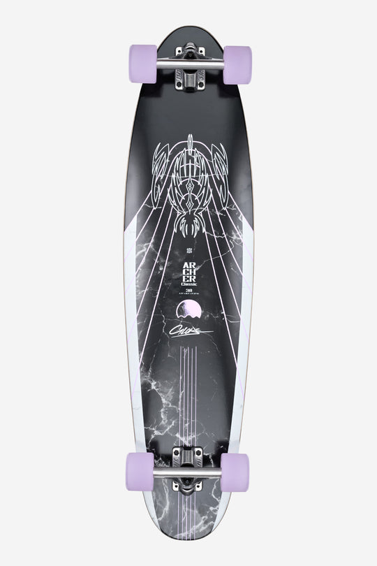 The Archer Classic "Bamboo Purple" is a 9.75" wide x 38.5" length longboard with a longer 27.25" wheelbase longboard which bounces through turns courtesy of the flexy bamboo and 7-ply construction rolling on stable reverse kingpin Slant trucks and 70mm 78a Bender Wheels.