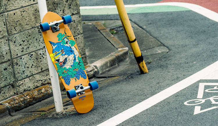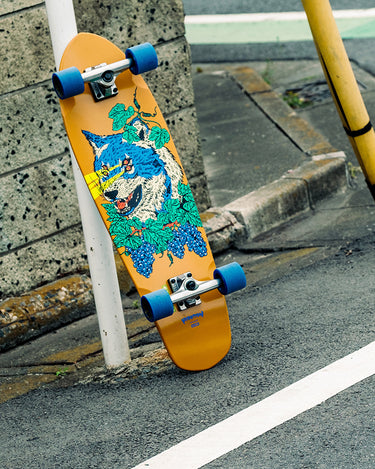 Medium length diamond tail cruiser with soft conical wheels. The Big Blazer 32" Cruiserboard in Lazer Wolf is constructed from Resin-7 hard rock maple and features mellow concave with kicktail, die-cut grip with top art and custom graphics from featured artist Hirotton.